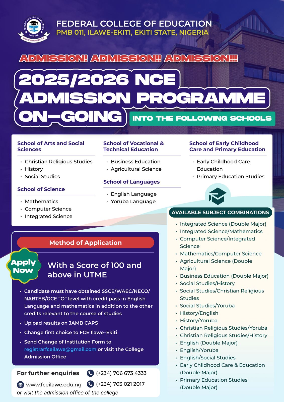 The Federal College of Education, Ilawe-Ekiti, welcomes prospective students to apply for its Nigeria Certificate in Education (NCE) programme, designed to equip future educators with the knowledge, skills, and professional values needed for effective teaching.